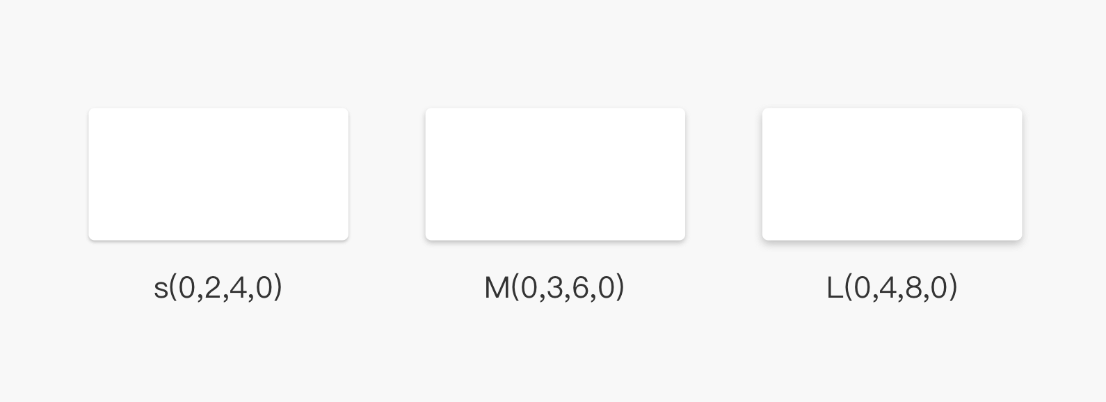 web端:一般我会设置为三种阴影样式S、M、L 与之对应的数值设置(0,2,4,0)(0,3,6,0)(0,4,8,0)