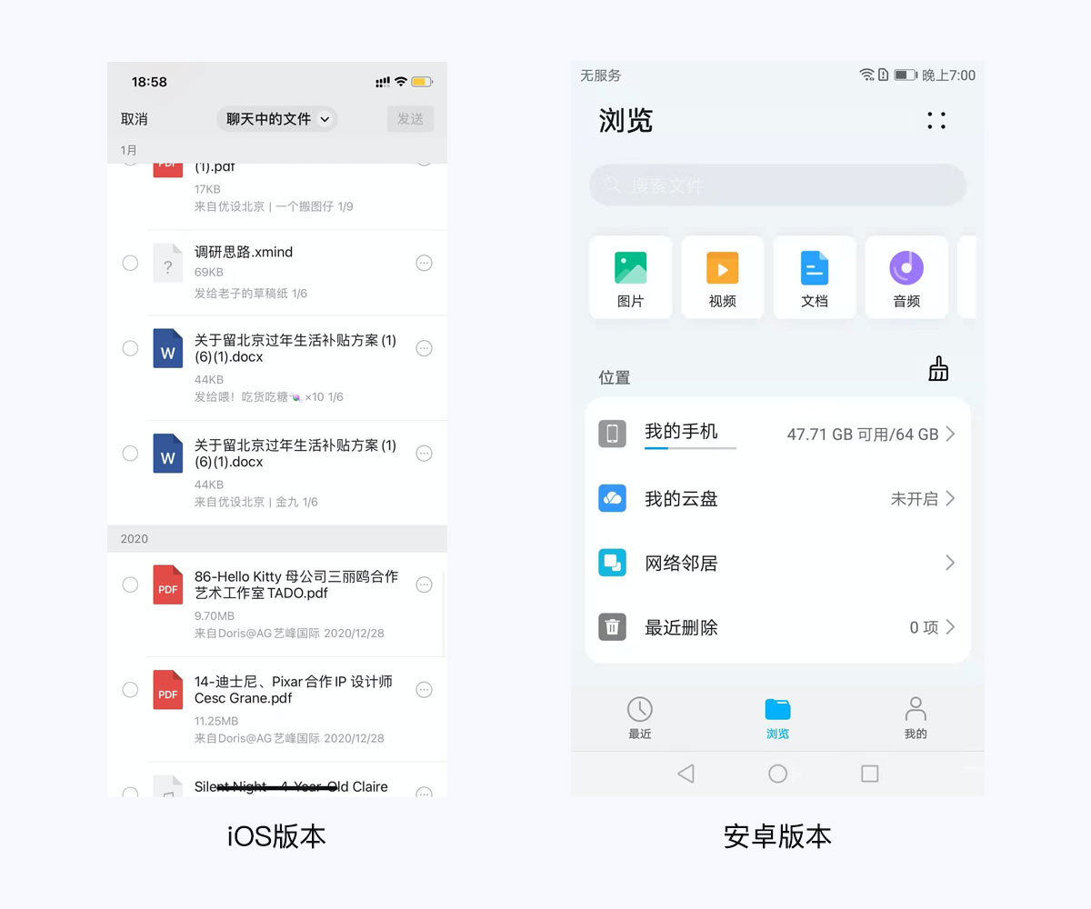 如果iOS版app想要发送文件时,则无法选择对应的文件夹里面的文件。但是因为有了iCloud的存在,可以通过iCloud选择文件。而安卓版则可以调取文件夹,选择对应的文件发送。如下图所示,qq给好友发送文件时,直接进入手机的文件夹中找到对应的文件。