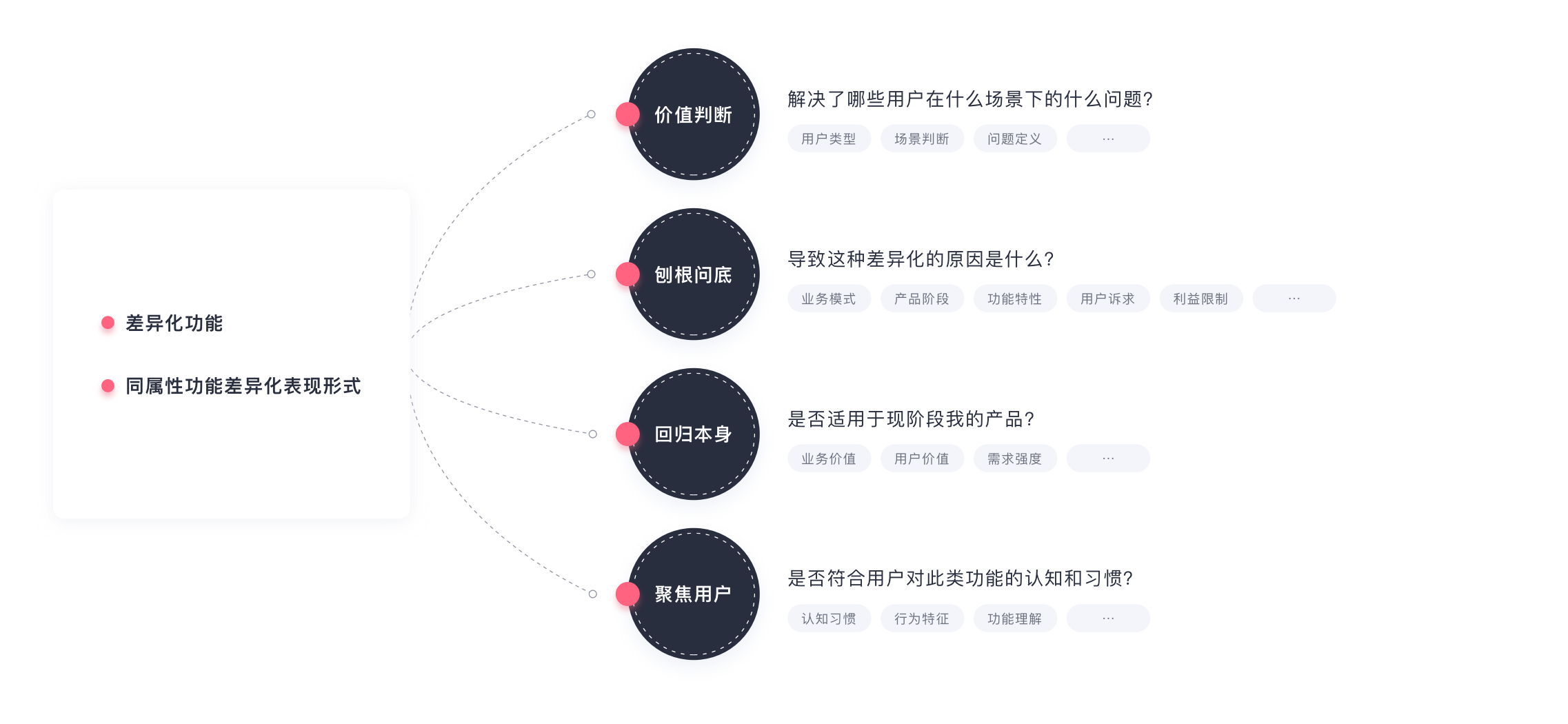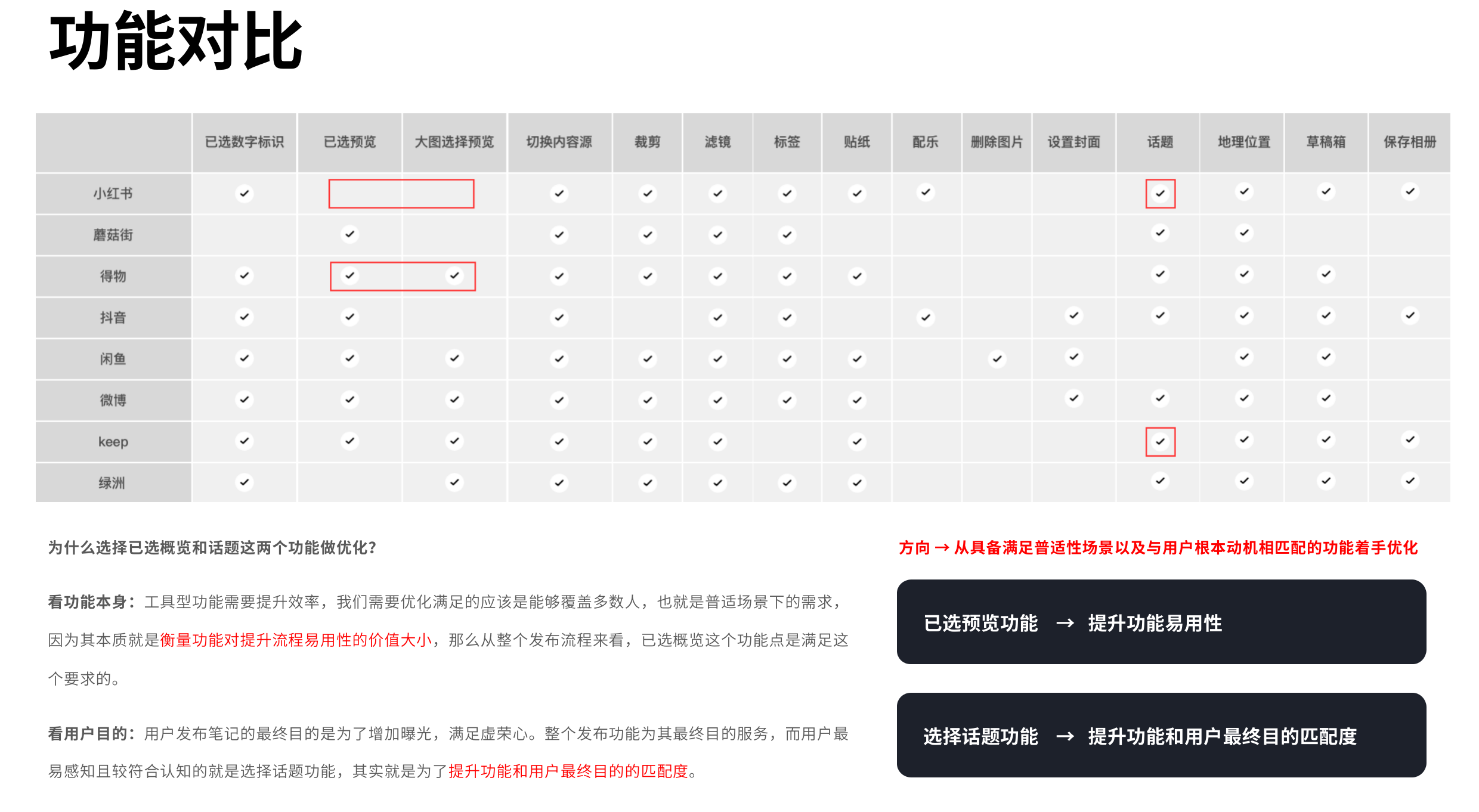 这一步才是竞品分析的核心,还记得我们前边说过,竞品分析分析的是功能逻辑,其实就是对比功能的差异去分析背后的原因,再去思考其适用性。