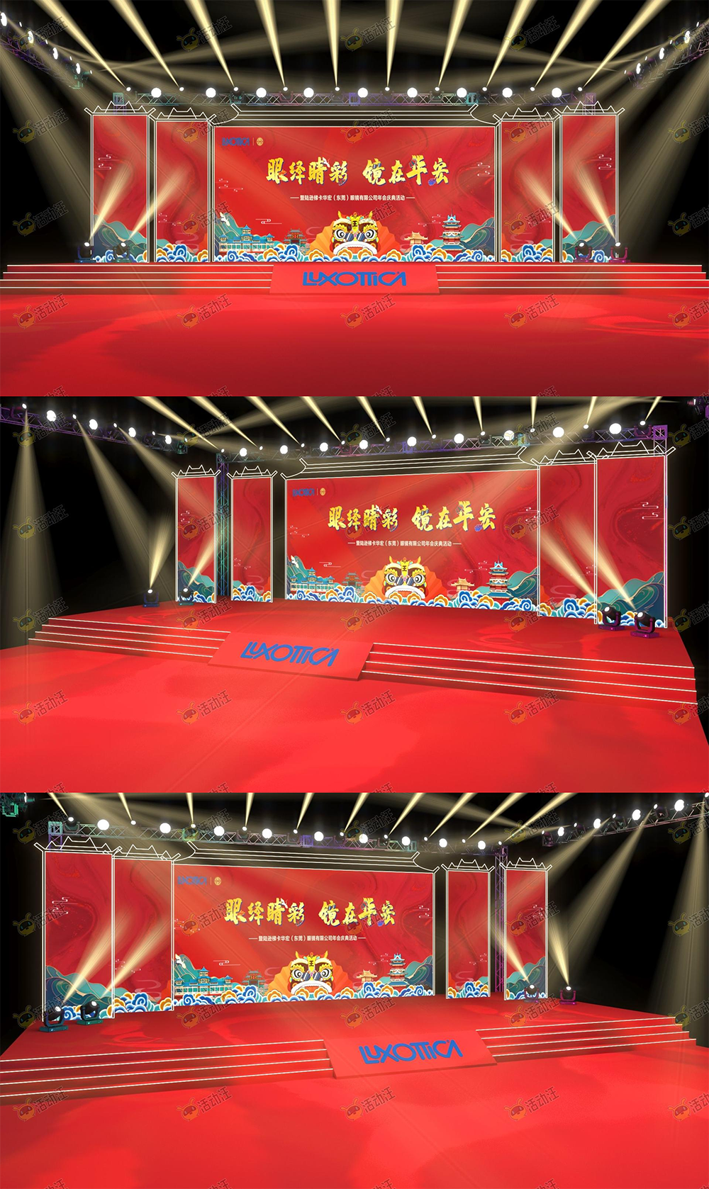 推荐理由:舞台主体以中式建筑的形式进行呈现,以红色为主色调,生肖元素的运用结合中国风元素,营造了喜庆满满的节日氛围感。