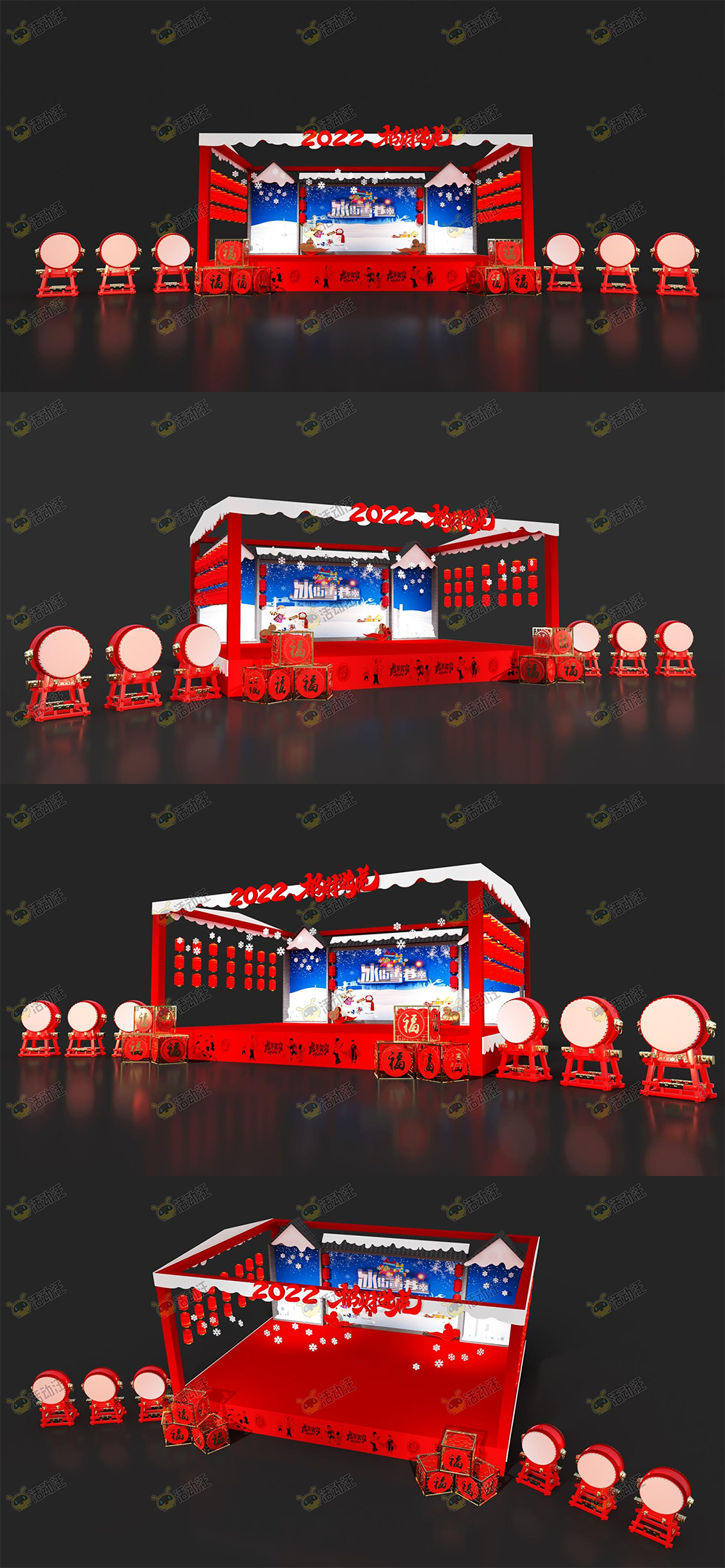 推荐理由:舞台两侧摆放福气堆头、大鼓,悬挂红色灯笼,将新春喜庆的节日氛围渲染到极致,还有白色雪花点缀,为红色的视觉感受增加了冬日的清新。