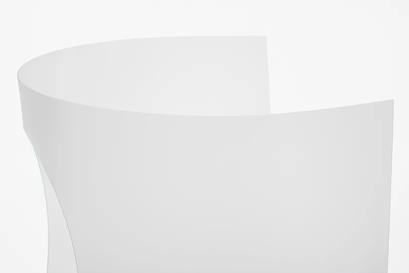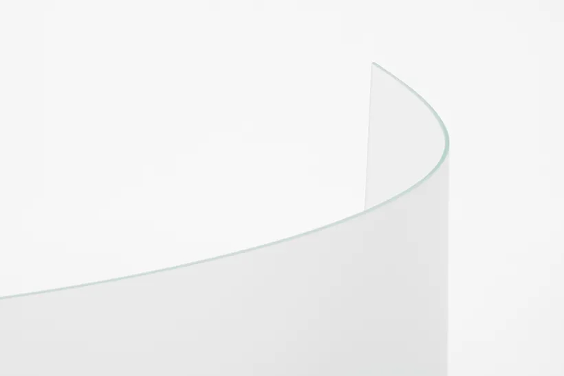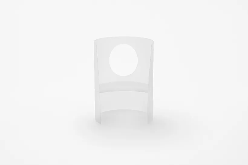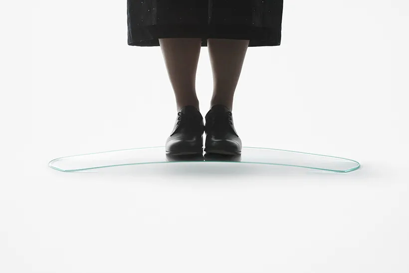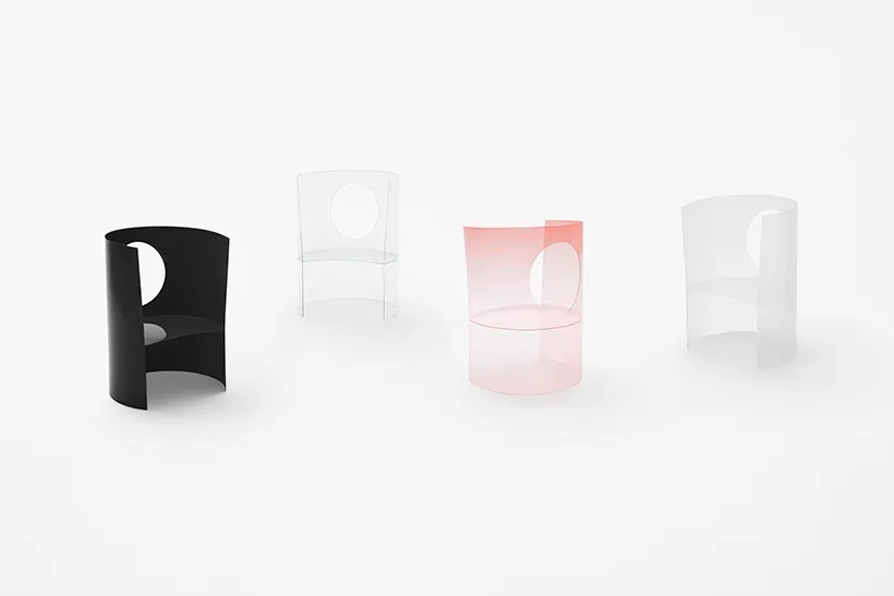 该座椅使用的原料为一张长宽为1800×1100mm,厚度为3.0mm的玻璃板。nendo开发了一种新技术,使其可以弯曲成 C 形,而以往的技术通常只能弯曲成U形。将弯曲加工后的玻璃板作为椅脚兼靠背,将另一块成型3.0mm厚度的圆形玻璃板则作为座面使用。
