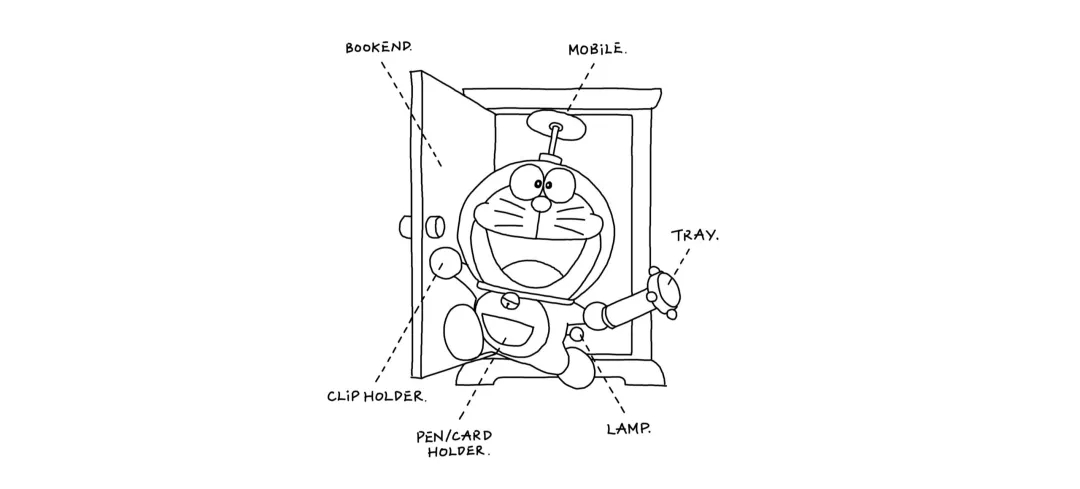 区别于目前市场上大多数直接采用描绘IP形象,又或是将IP简单地放在产品之上来进行设计的方法。nendo则采用完全不同的创意,将目光放在哆啦A梦这个IP的元素与工具之上,通过与众不同的方式拓展新用户群和使用场景。