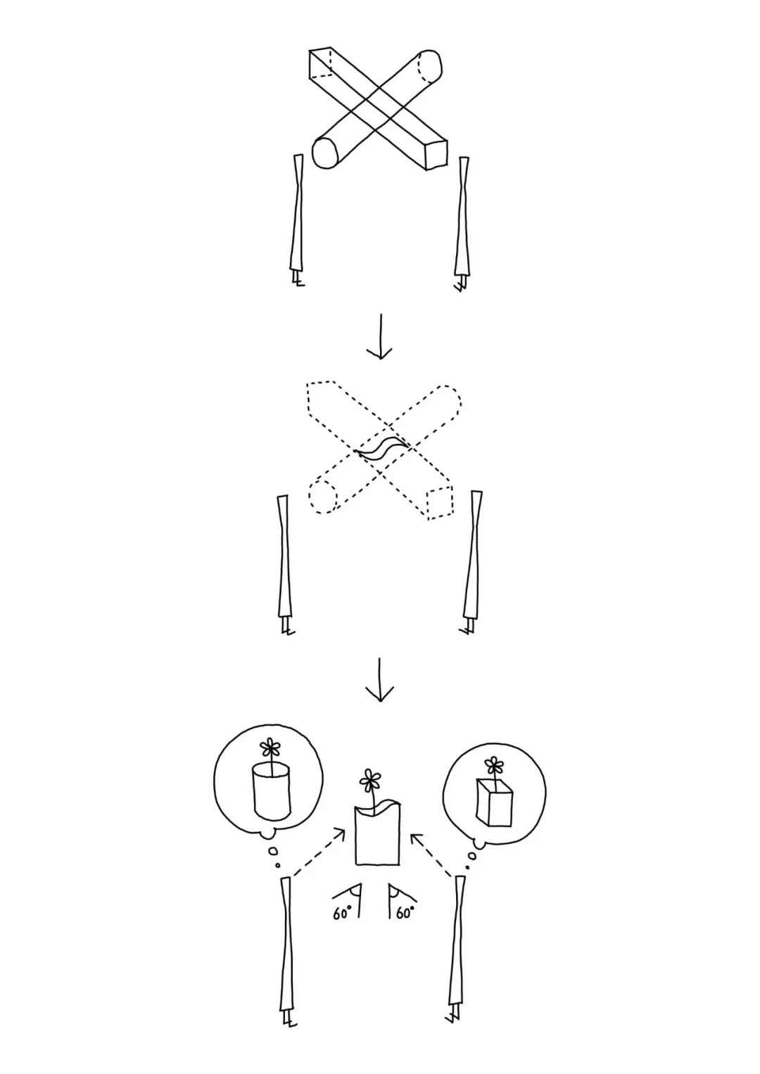 设计师在过程中先设定两个“视点”,从各个视点延伸分别模拟出的“四方柱”和“圆柱”。然后,提取出交错的线条,以此为基础设计了花瓶。