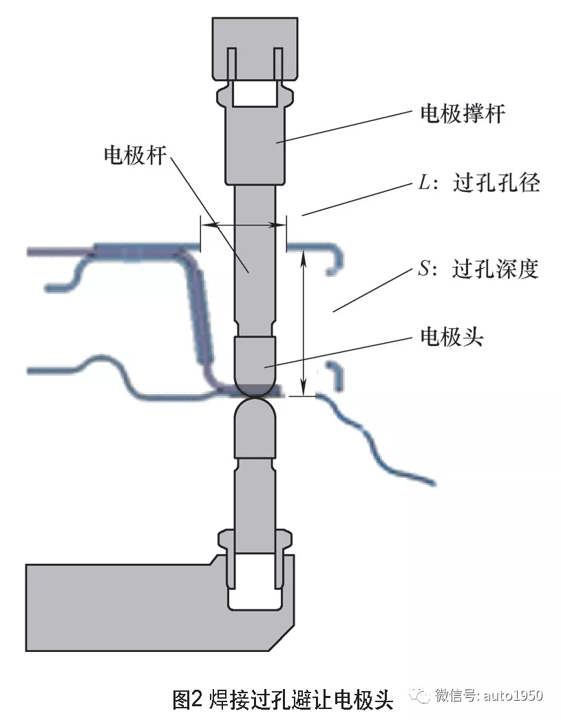焊接过孔避让电极头的情况下,过孔与焊接面贴合时,焊接过孔的大小需超过焊钳电极帽的直径,一般要求≥φ 16mm;当焊接过孔与焊接面间距为0~20mm时,过孔直径要≥20mm;当焊接过孔与焊接面间距为20~70mm之间时,过孔直径要≥25mm;当焊接过孔与焊接面间距>70mm时,过孔直径要不小于40mm。注意空腔距离低于70mm时,过孔处通常为电极杆(f 16mm),超出70mm后,过孔处通常为电极杆座或粗电极杆(f24mm),按表2中的要求进行。