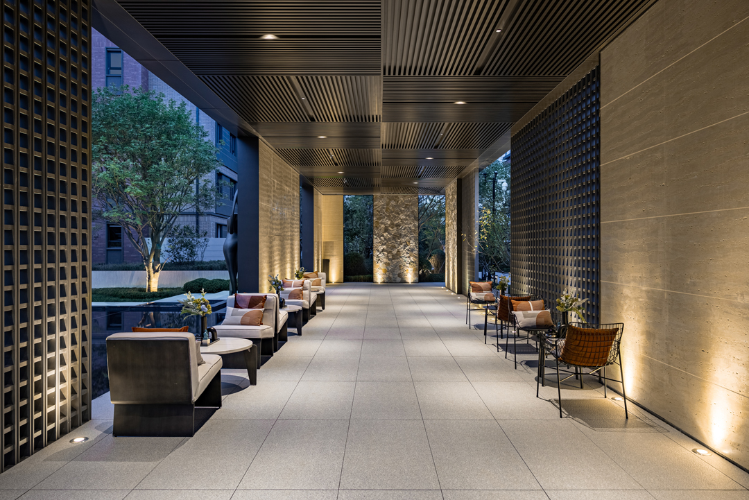 廊架格栅的设计打破地产景观以往的装饰化风格,将常规的金属材料进行单元式重组,推敲空隙大小达到最佳疏密。低调的表层质感与自然石材结合,形成不张扬但却充满力量的工业气质。