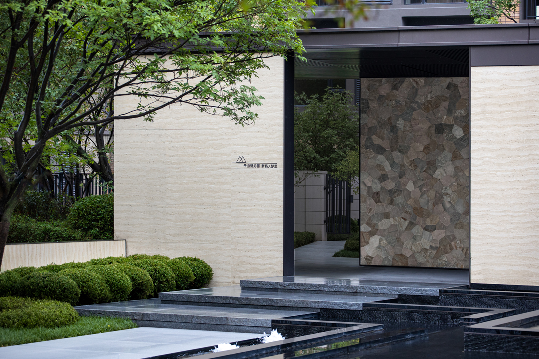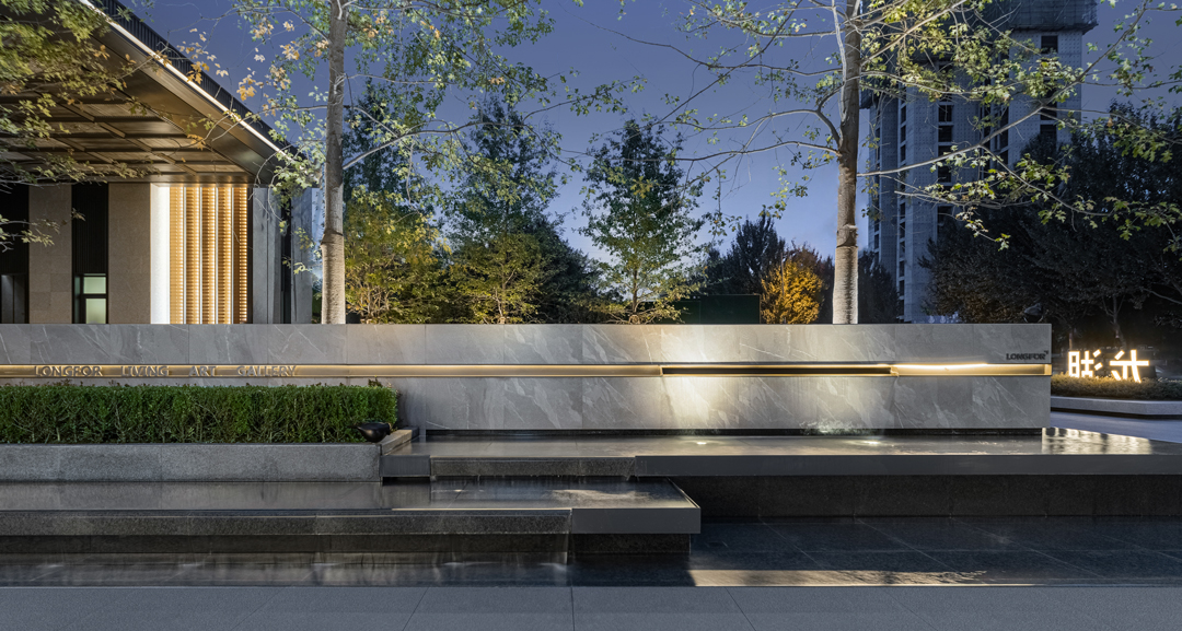 流水景墙横向展开,中和了大门立面强烈的节奏感。作为售楼处出入口对景的同时,兼具分隔未来商业与归家区域的功能。水面从大门前轴线镜面水延展过来,层级而下,形成互相连通又动静结合的水景景观系统。