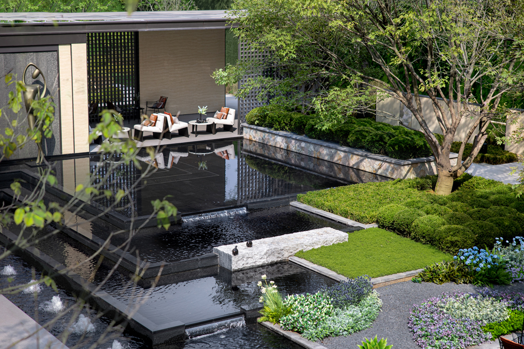 会客厅连廊前的水景借助场地原有的地形,以层级抬高的镜面水景消化场地高差,将亲自然理念注入场地,使面向连廊的视觉效果更加壮美。水面叠瀑,平台漂浮于其上,搭配飘逸质朴的植物,踏水而入抵达休息平台,形成栖居自然中的和谐景象。