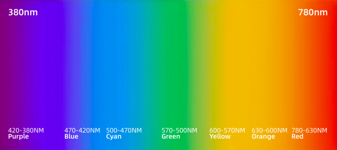 有色光波长分布/nm: 红--780~630 橙--630~600 黄--600~570 绿--570~500 青--500~470 蓝--470~420 紫--420~380