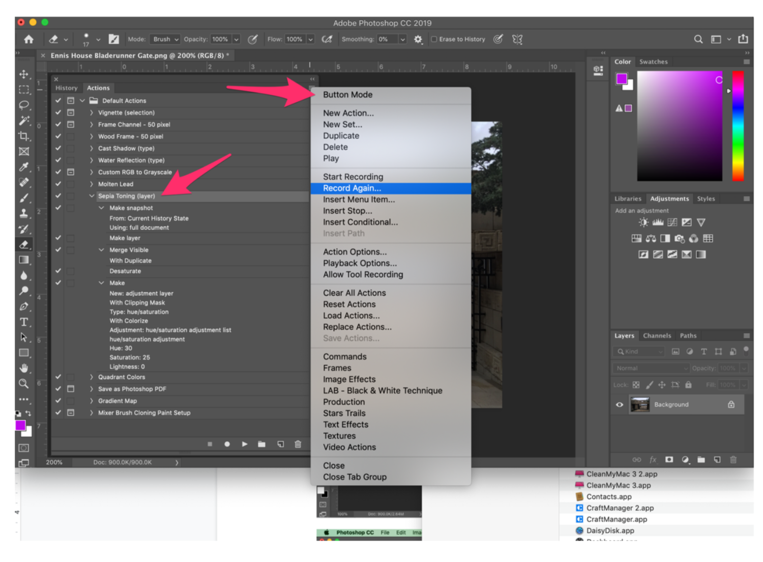 Adobe Photoshop CC 中具有广泛的宏功能应用。主要功能是创建或记录复杂的多步图像编辑和转换命令。这在 Photoshop 中叫做“动作”。通过自动化和复用,使用“动作”显著加速了图像工作流。以下示例中,在左侧,选中了一个名为“综合色调(Sepia Toning)”的动作来显示该动作中依次发生的多个嵌套步骤。在右侧,动作菜单显示了录制、编辑和微调复杂的多步骤动作的选项。