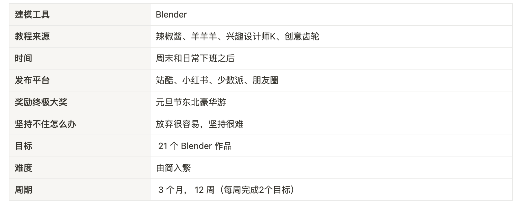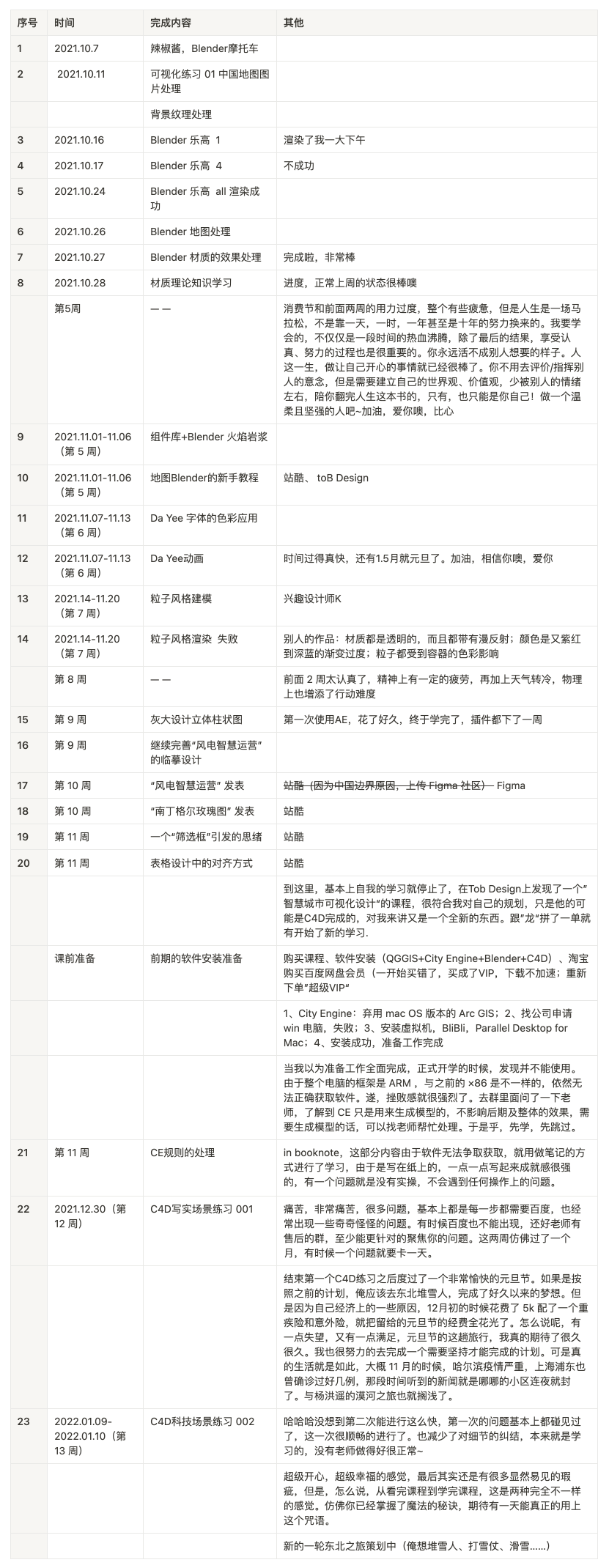 如果你看的仔细的话,其实整个记录的过程很随意。时间也从具体日期,变成周记。学习的内容页偏离了我一开始想要想要精进 Blender 的学习计划。前面 14 次基本上还是 Blender的学习计划的,也怀疑过自己,但是,我要学的不仅仅是一个工具,而是一个工具能更好的让我解决问题,而解决问题,当然有很多种方式,反思当然算一种,临摹、以及新的设计方式方法当然都可以呀。所以,每当我自责的时候,我都会告诉自己,主要走的大方向没错,多走一回儿也没事呀。