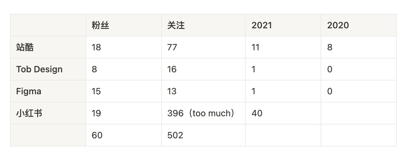 总的来看,Figma 的粉丝转化率最高,一个作品获得了 15 个关注;其次是Tob Design,1个作品收货了 8 枚粉丝,另外一个昨天是昨天才发布的(2022.1.10)。非常感谢伙伴们的支持,咱们网络一线牵,珍惜这段缘~