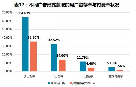 就数据来看,第二天试玩广告的留存率高达64.63%,是其它数字营销广告的30个百分点。而另一方面,可玩广告的5.10%的游戏付费率则更高。总结很简单,手游厂商想要吸引高品质的玩家,互动试玩广告的确是个不错的选择。