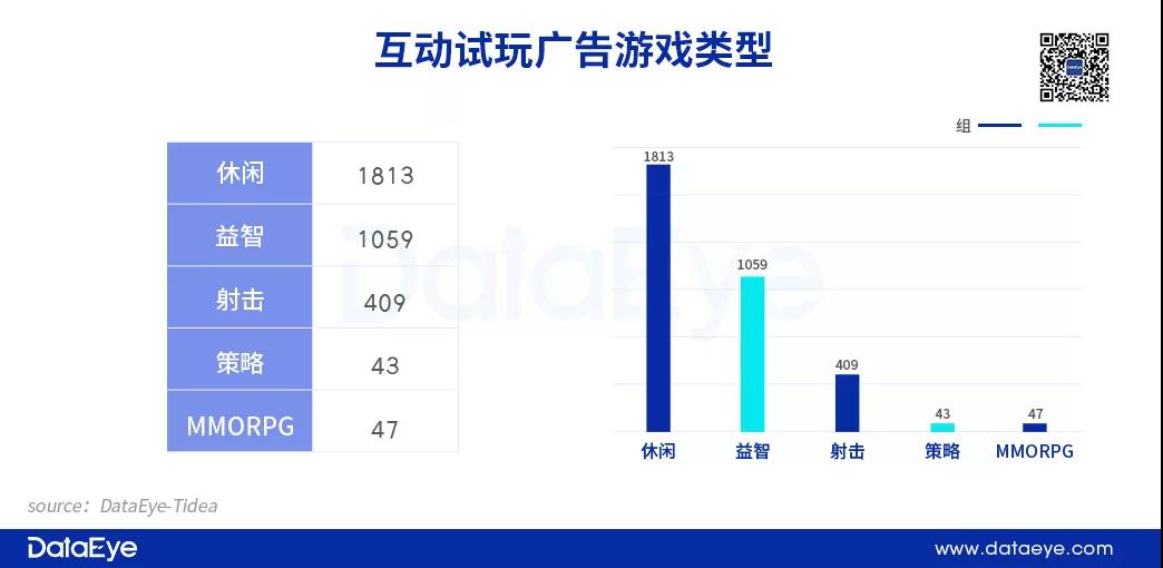 在数据上,互动试玩广告更多的是轻度休闲手游,而中度度高的游戏则很少采用互动试玩广告。