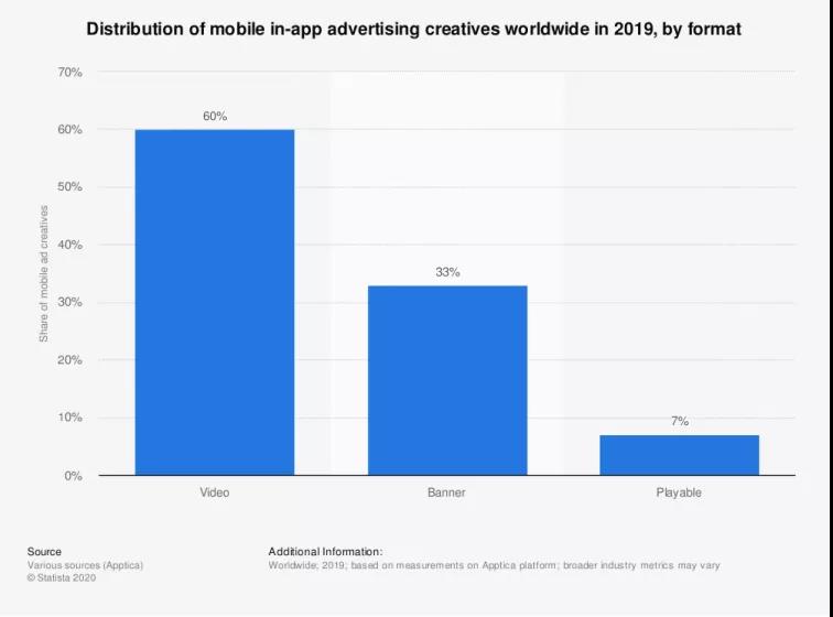 据 Statista的数据,在2019年的手机广告市场上,互动式广告占市场份额仅为7%,而相对于视频广告和 banner广告,其市场渗透率与其普及程度相差甚远。