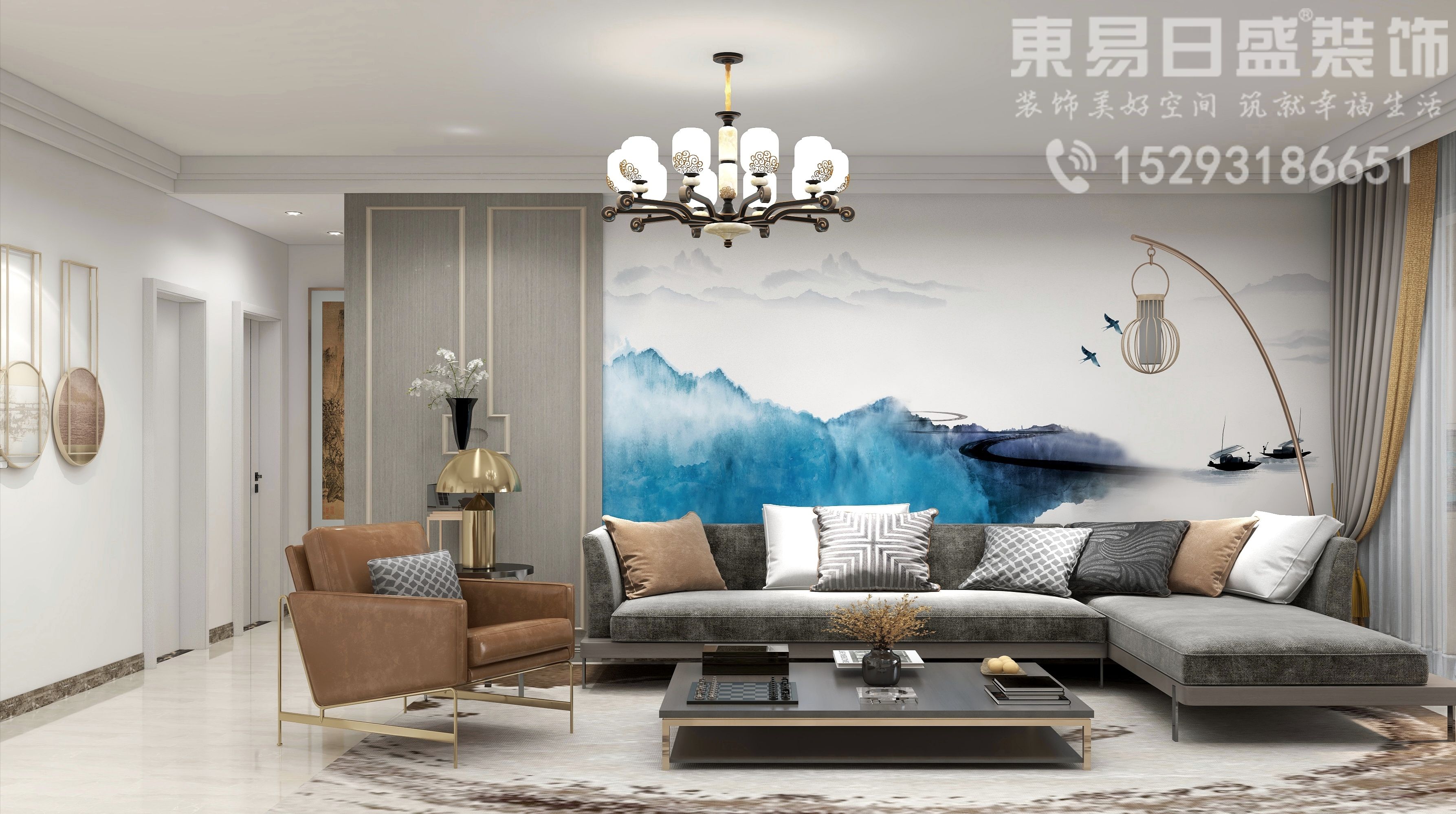 背景墙装修效果图2022新款:时代星空-128平米-新中式风格装修设计效果图;东易日盛超放心家装热线15293186651.