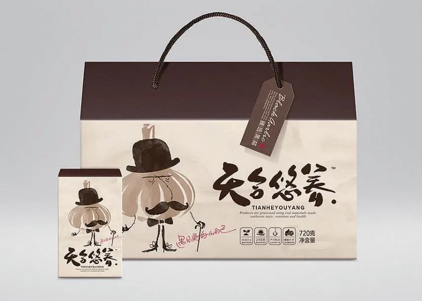 从食品行业的要求来说,它的风格饱满、轻快,文字以一个墨点收尾,在“合悠”下方预留的空间加了拼音;从Logo的章法来说,这4个汉字是主视觉,风格十分鲜明;在包装设计的画面搭配中,除了必要的标注和主图案,其他地方都采用留白,并且主图案采用卡通水墨表达,表现出包装设计师的用心。