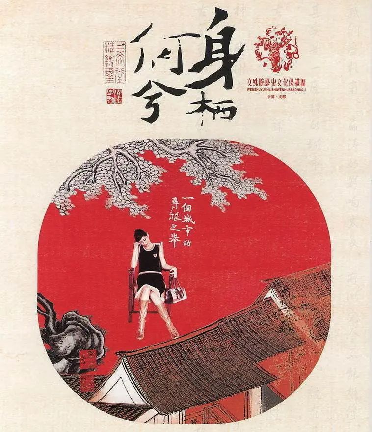 中国传统民居建筑与现代时尚的人物融合得恰到好处。同时,整个画面大面积留白,亚麻色背景和内部大红色主图的对比也体现出了深厚的文化底蕴。
