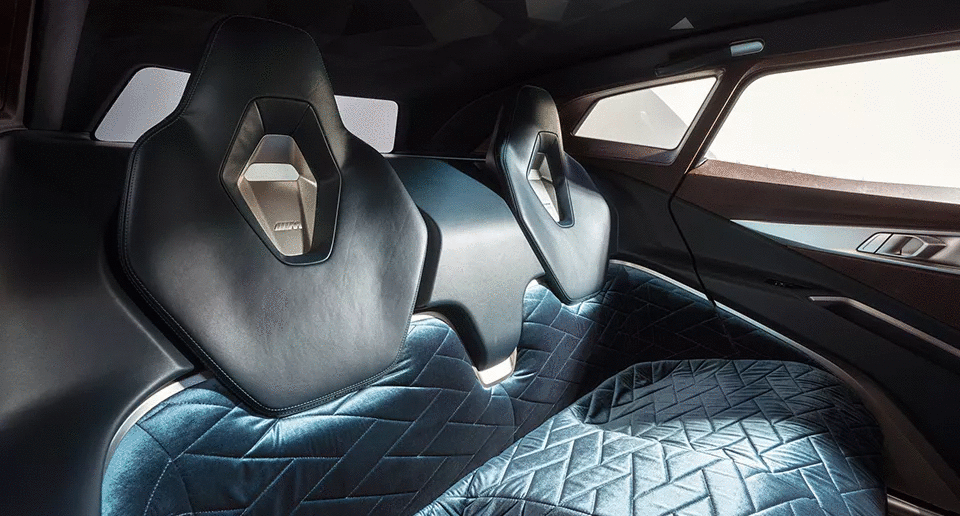 连体式座椅突出了其运动感,第二排搭配海蓝宝石色的天鹅绒座椅,非常豪气。与此同时,几何形车顶内衬设计搭配环境照明设计,为我们打造了一种类似于浮雕般的效果。