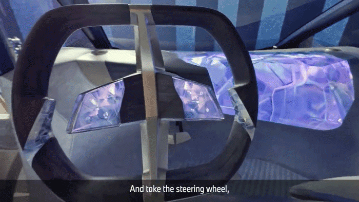 带有可伸缩方向盘和踏板的数字驾驶舱,当汽车处于自动驾驶时,可以收起来。