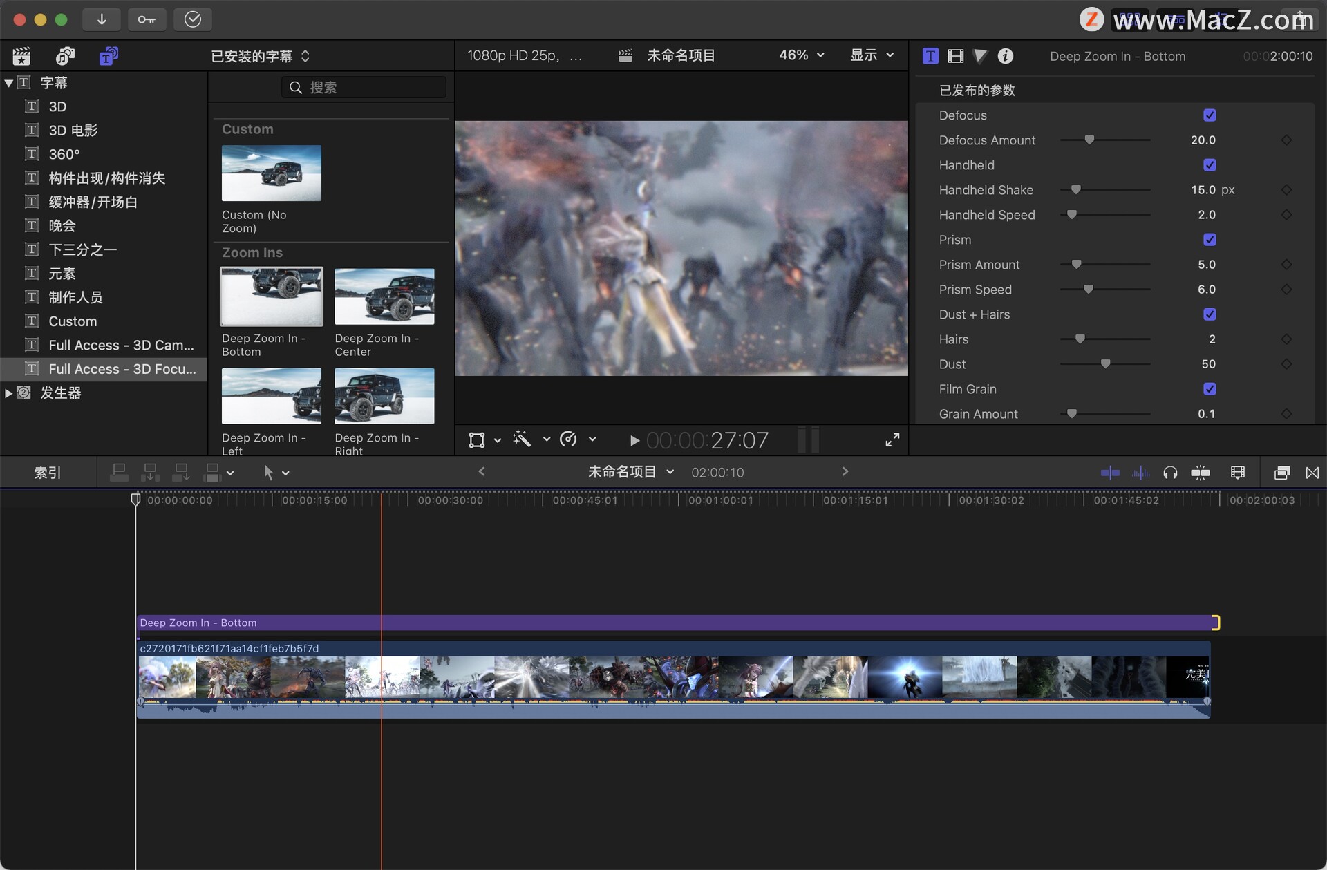 fcpx插件:3D Focus Puller是一款功能强大,操作简单的动画缩放效果插件,只需将此效果拖放到您的剪辑顶部,其余的就为您完成了,使用简单,没有关键帧,只需将效果像标题一样放在剪辑上方,然后观看缩放。