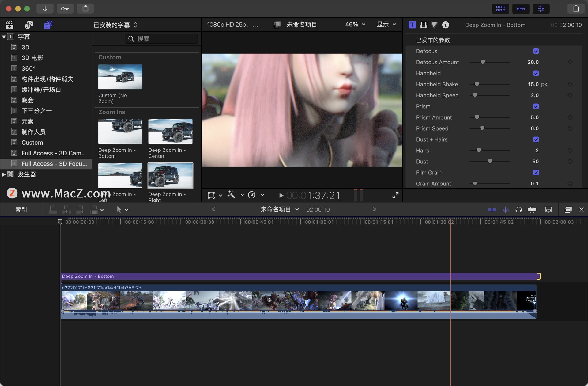 fcpx插件:3D Focus Puller是一款功能强大,操作简单的动画缩放效果插件,只需将此效果拖放到您的剪辑顶部。