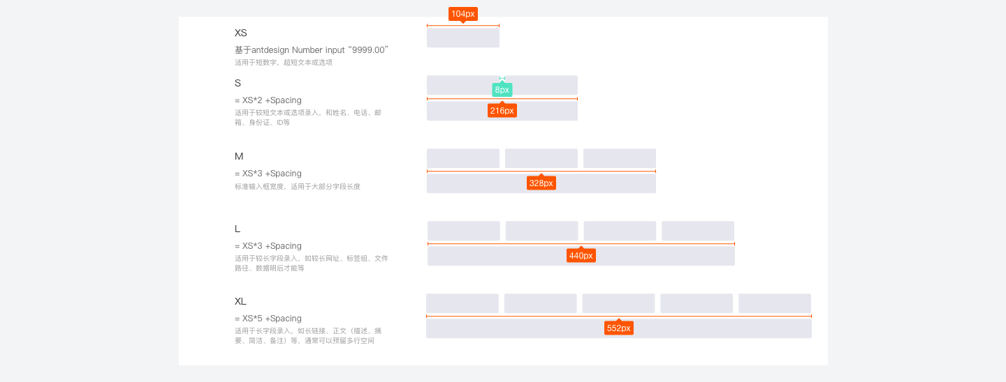 我们可以站在AntDesign这个巨人的肩膀汲取一些相关经验,其中4.0系列分享的文章中总结到其经过对十几个业务线梳理,将组件宽度定义了5中高频的空间尺寸,分别是: XS(80~160px)、S (160~280)、M(280~360px)、L (360px~480px)、XL (480~560px)。根据原理,我们可以假设原子宽度XS为100,那么通过尺寸的倍数+间距的方式来计算其他的四种尺寸(间距暂定8px情况下得到:S=208px、M=316px、L=424px、XL=532px),通过此计算方式也是用来解决视觉对齐规则,如下图所示: