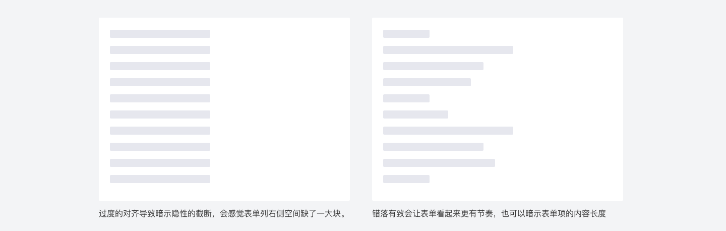 如下对比图所示,右图错落有致的排版表现似乎比整齐划一的左图更舒适,因为在视觉上我们更容易将右图的空间和内容视为一个和谐的整体,但左图过度的对齐导致暗示隐性的截断,我们会感觉表单列右侧空间缺了一大块。