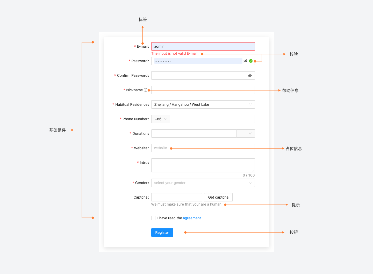 帮助信息:当表单标签不足以对输入项准确说明时,这时候需要使用文本提示用户。它不仅能让用户提前感知输入后的样式,还能够有效的告诉用户该如何输入以及表单提交后达到的目的。