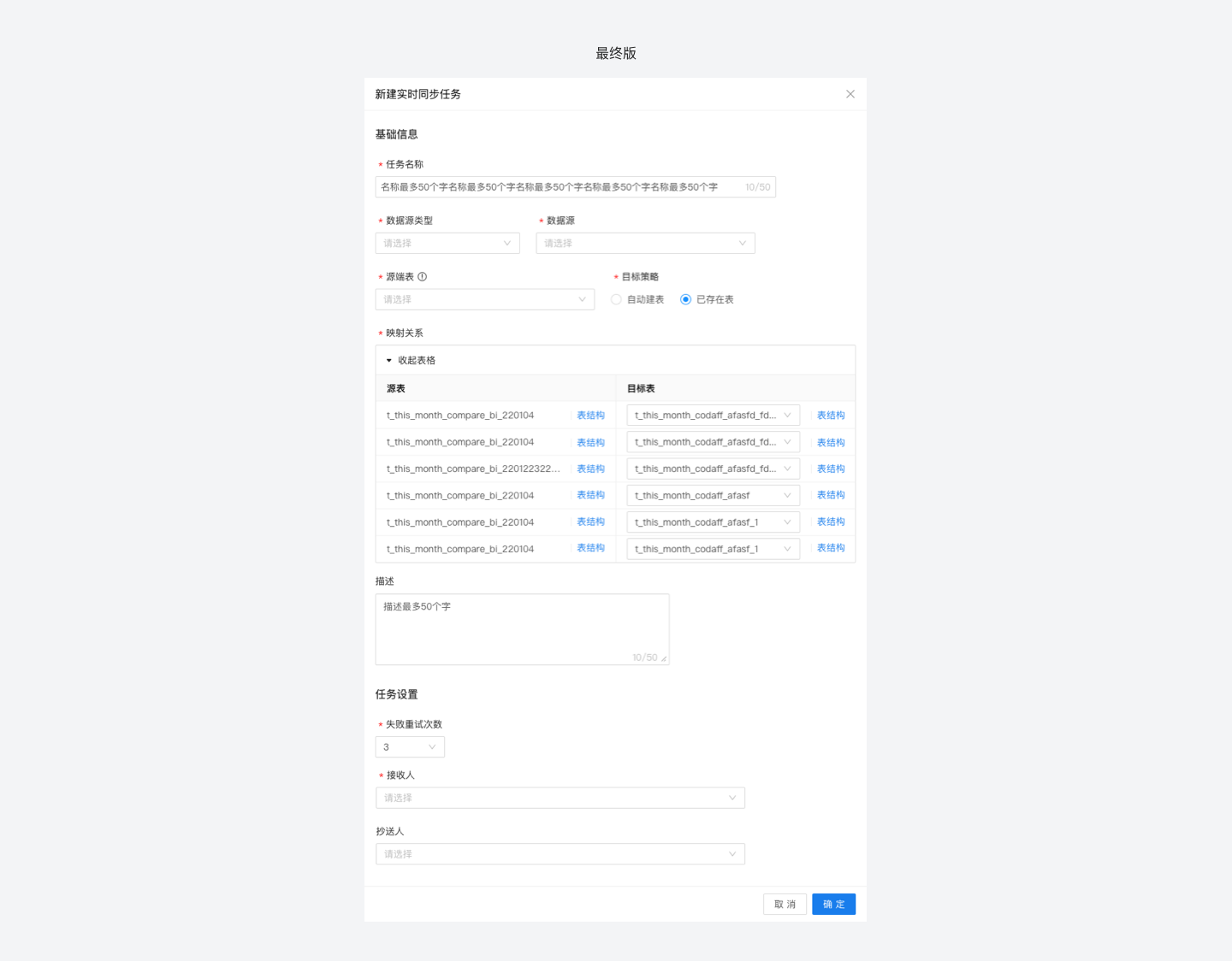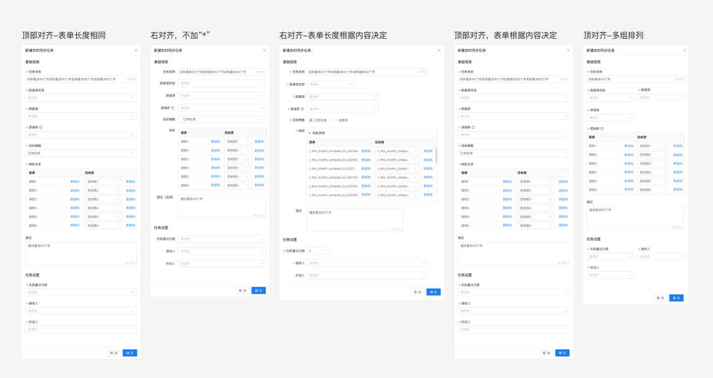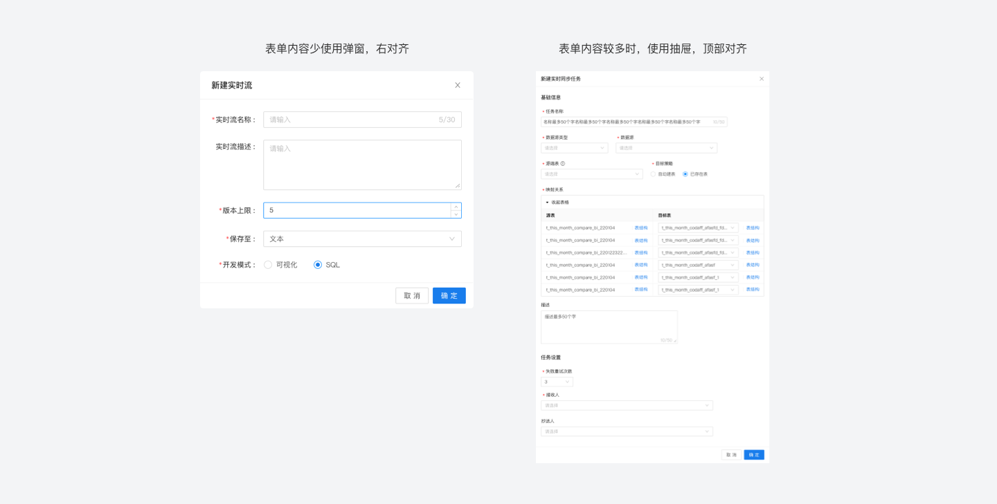 经过项目中多次反复实验,以及与产品经理、设计师多次讨论后,我们定义了一个原则:表单内容较少时,使用弹窗,且为了减少竖向排版空间,采用右对齐方式;表单内容较多时,使用抽屉弹窗,采用顶部对齐方式。