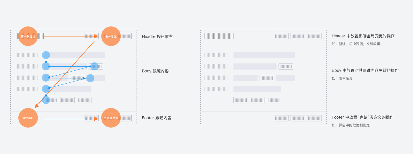 仅有表单时建议采用“F”模型,按钮位置跟随内容在左;当表单被包含在某个容器中,则建议使用“Z”模型,将“确认/提交”等行为放在右侧视觉终点处。