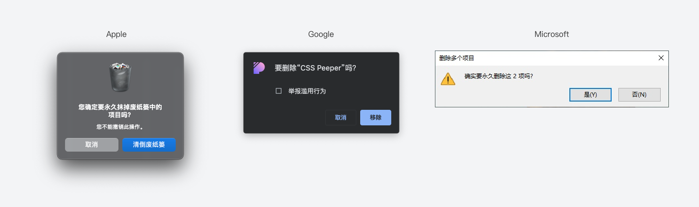 关于顺序,最常见的疑问是确定按钮应该在取消按钮左边还是右边,这是一个争论已久的话题。在弹窗中,确定按钮和取消按钮的顺序在各设计体系中都不一样,下图是操作系统三巨头:Apple、Google、Micrisoft 的方案。三巨头证明了两种主次顺序都能被接受,只要在系统中统一即可。