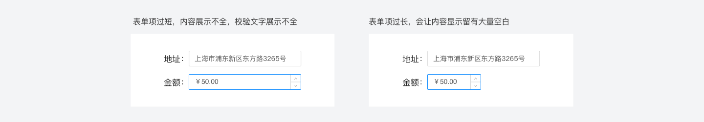实际业务中,大部分 input 所需填写内容都存在理想长度,input 的宽度应该向用户暗示所需输入内容的长度来减轻判断负担。如下图即一典型案例,一个实际不需要花多少钱的金额输入框在左图中进行等宽处理的话,容易误导用户对所需输入金额的判断,造成极大不安全感。
