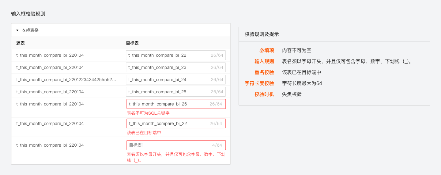 校验规则大致可分为参数、说明、类型、默认值等,校验规则可使用组件默认规则,也可以进行自定义;