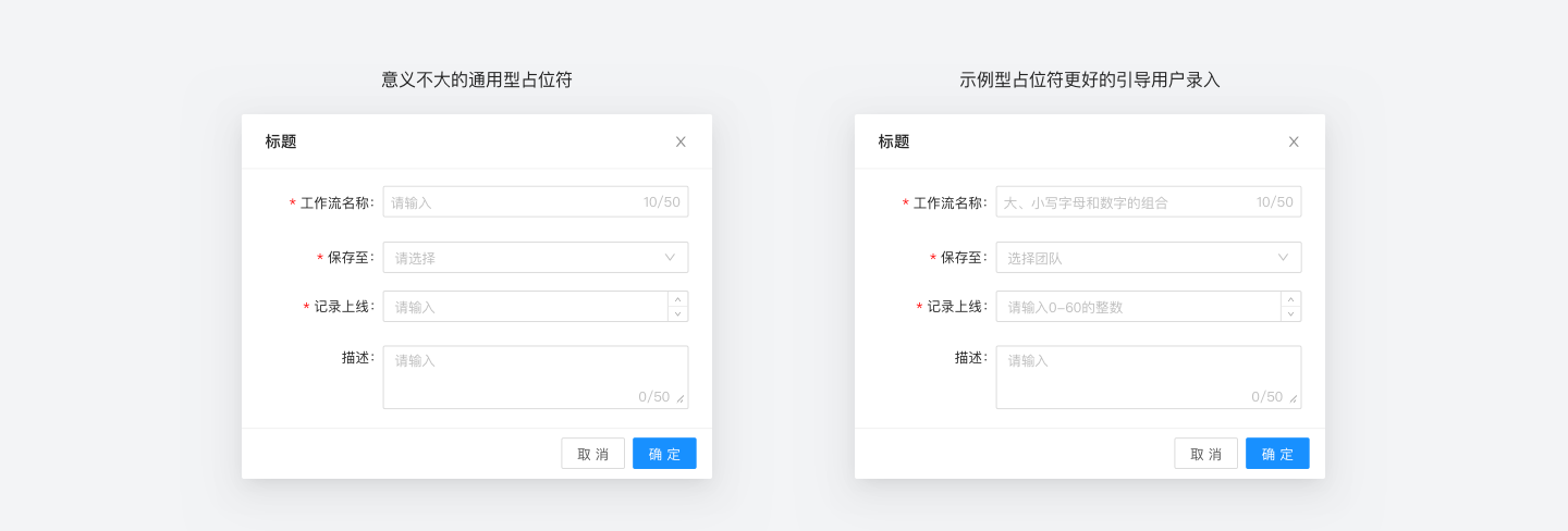 占位符有示例型占位符和通用型占位符两种。也可以算是一种轻量化的提示信息,与其他提示信息相比,视觉负担较小,占用空间更小,与输入内容的关联性更强;对于复杂的表单输入,可以使用占位符对用户做规则提示,减少用户输入错误的几率。