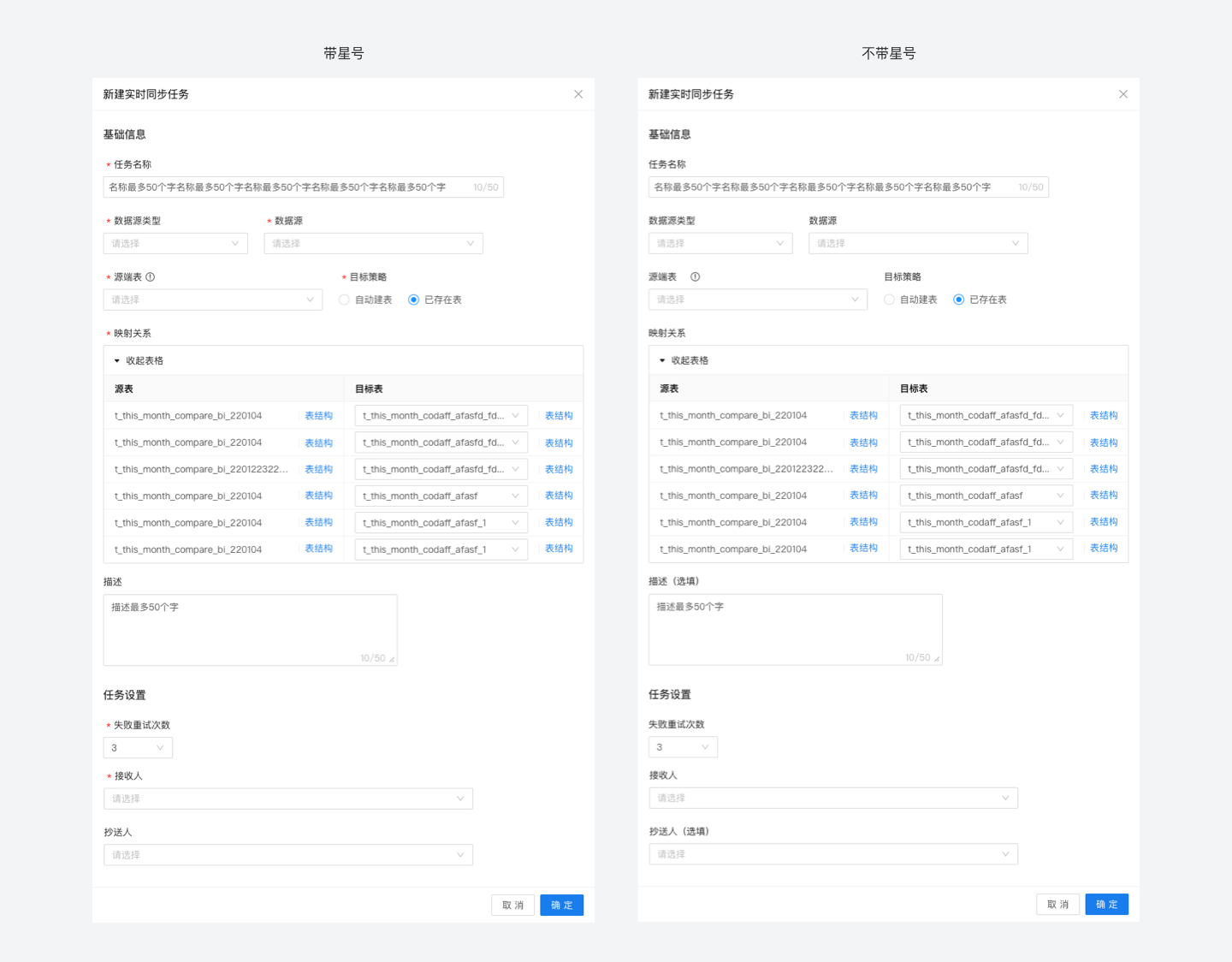 这里给出的建议是根据业务场景和用户习惯具体分析,不少设计系统在必填项较多时会建议去掉“*”,但是我在业务中跟产品经理沟通过后,决定尊重用户已有习惯,用“*”区分必填项和非必填项,否则用户在填写完成后,无法快速判断哪些是必填项哪些是非必填项。