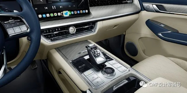 挡杆区域采用水晶挡把+蓝色真皮+真铝面板设计,多材质拼接,多重感受;