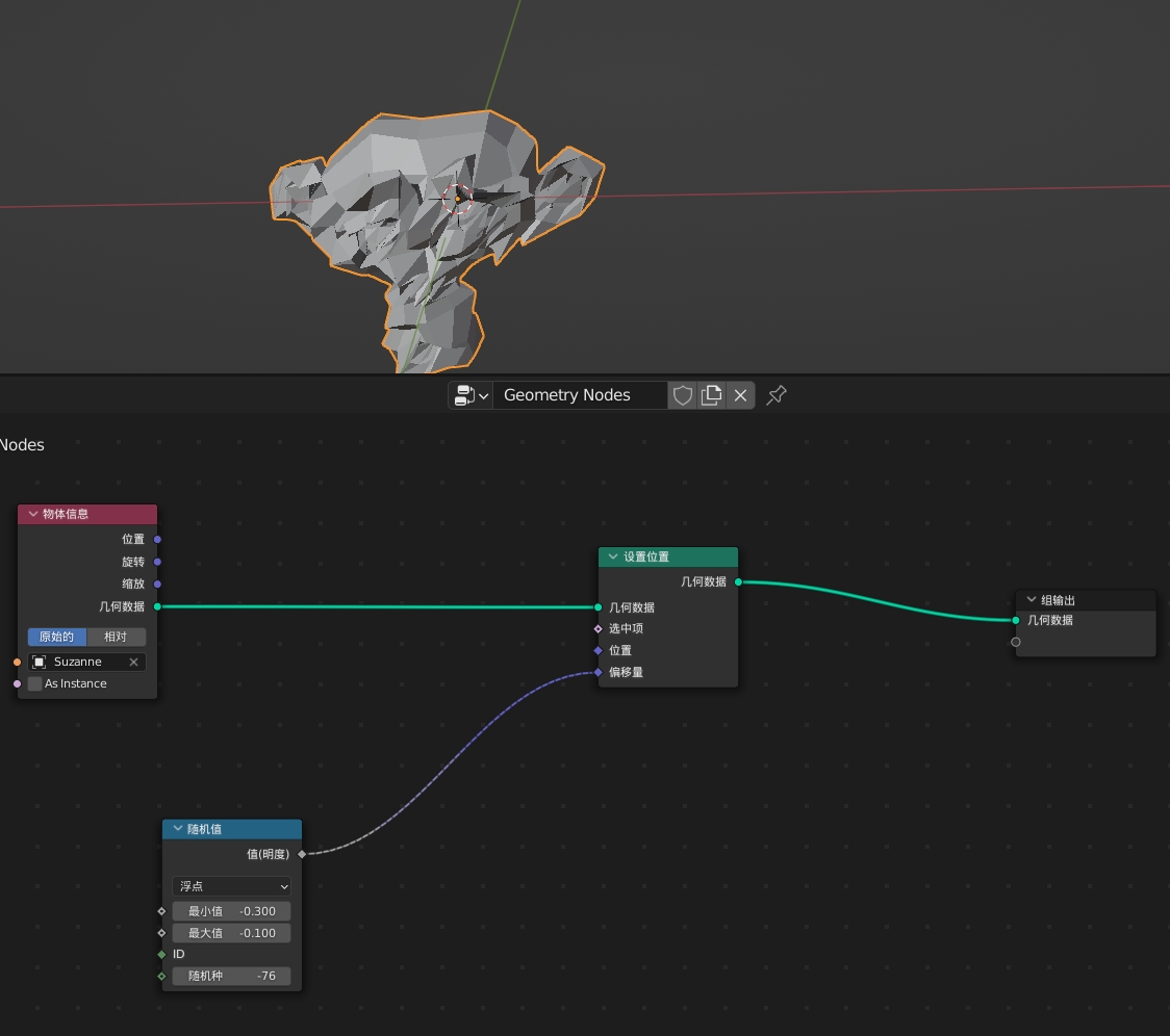 把变换节点替换成设置位置节点,使用设置位置控制物体上的点。这里偏移量使用随机值浮点控制,当物体信息下勾选As instance(作为实例)时,设置位置的位置或偏移量输入的值都是控制整个模型实例整体移动,所以要控制单个模型上点的移送时,不勾选AS。