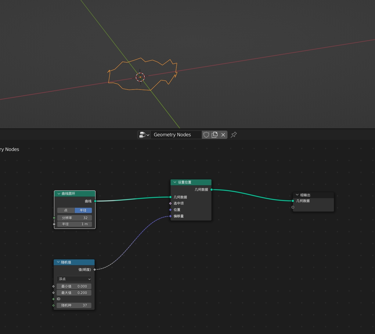 3.将猴头替换成线段,这里用一个曲线圆环节点替代猴头。此时可控制随机种让圆上的点跳动起来