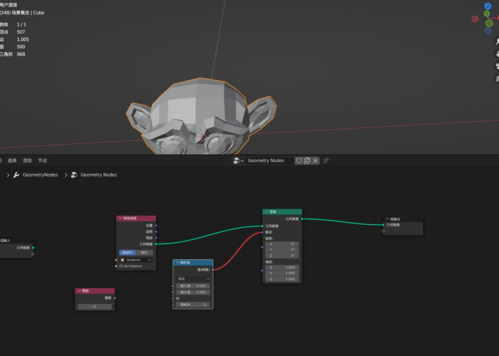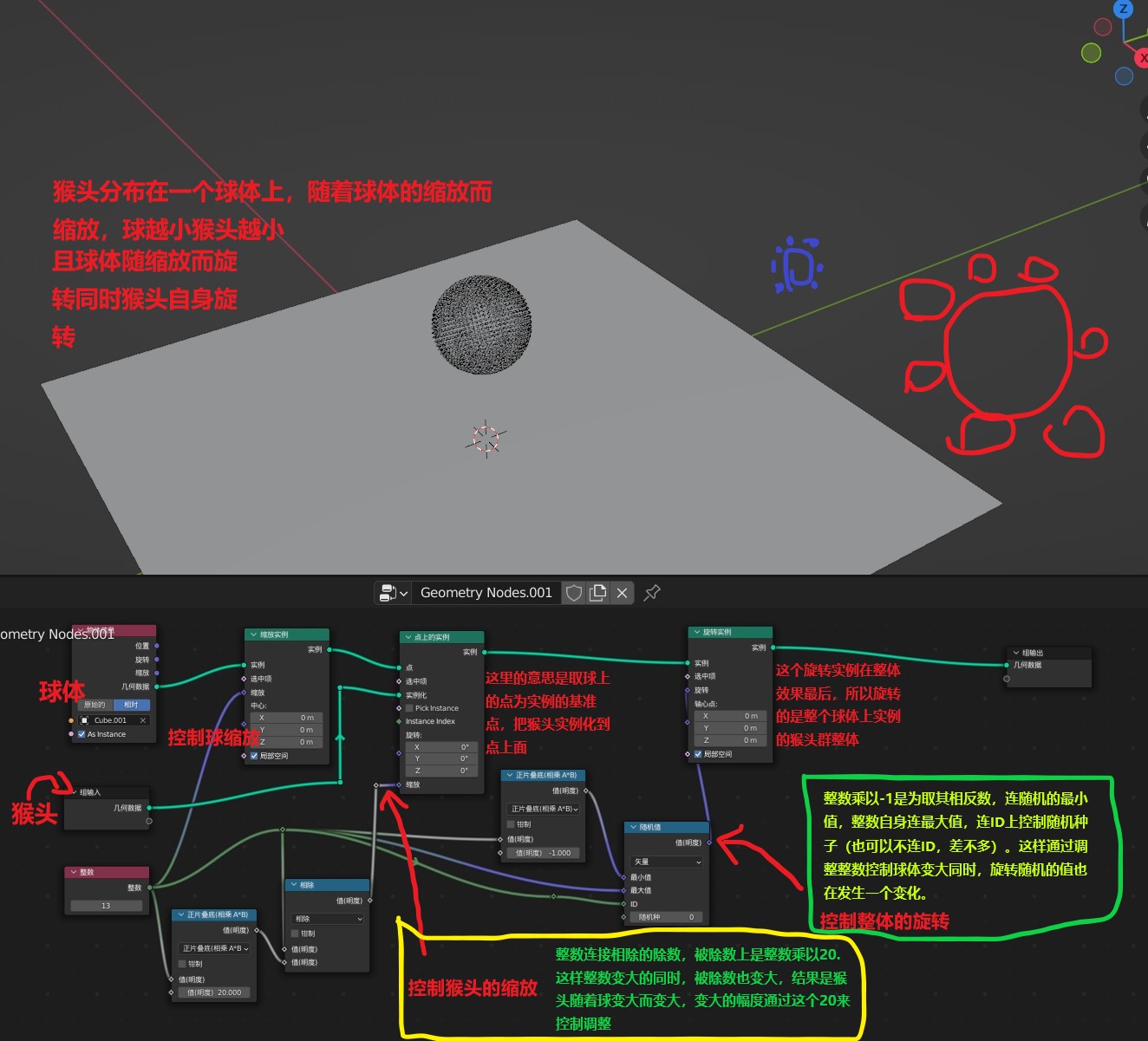 在球上实例化猴头,并且猴头随球的缩放而缩放并随机旋转。这里涉及到最基础的运算节点。逻辑都写在图上了