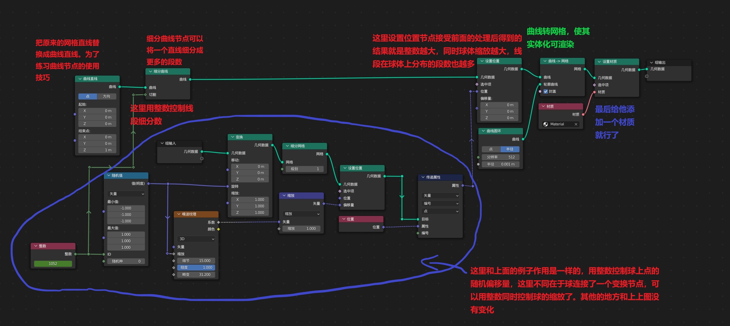 7.上图中在球后添加了变换节点,但没有连上缩放,这里补充。