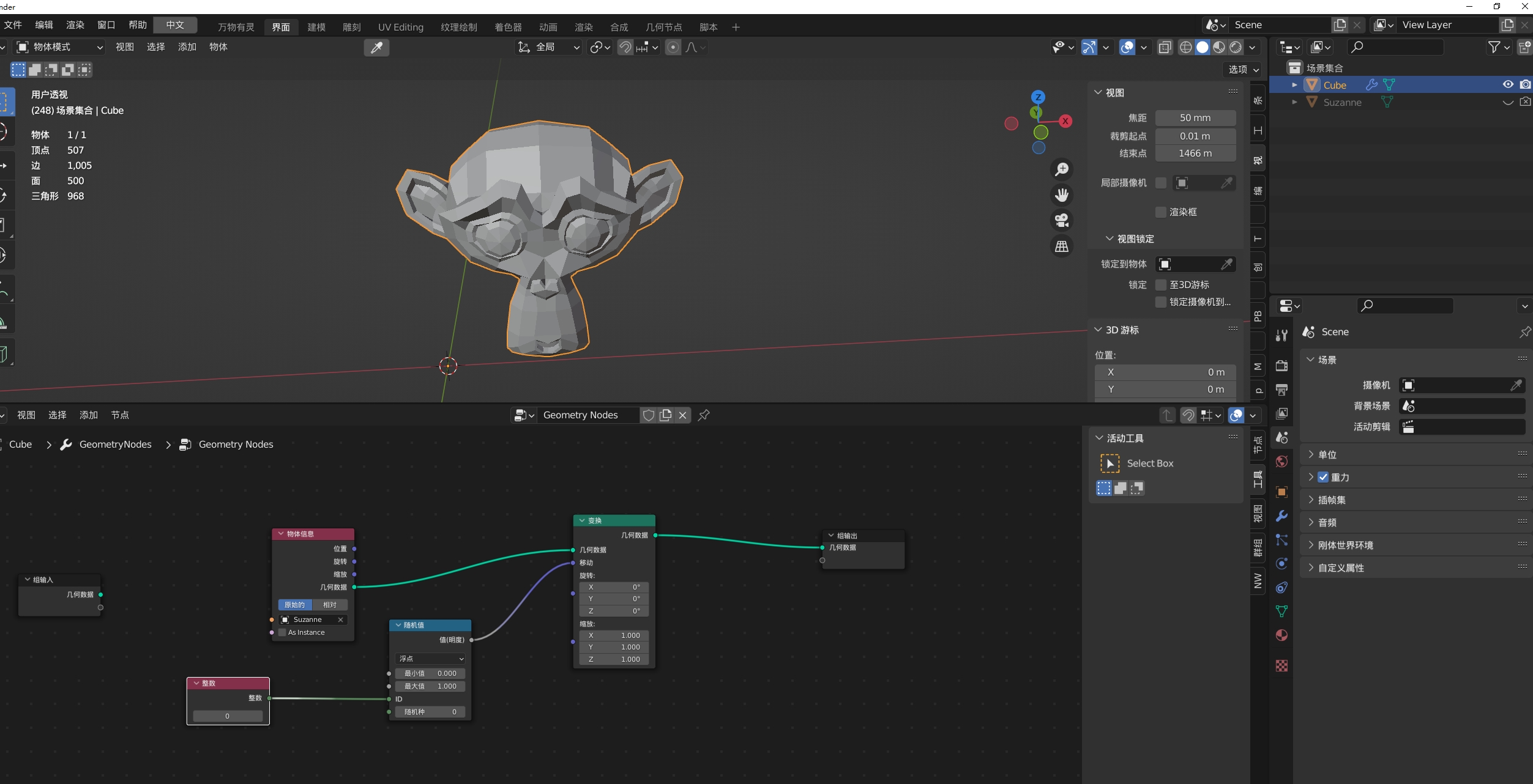 1.在某个模型上添加几何节点,并将原本的替换成猴头。