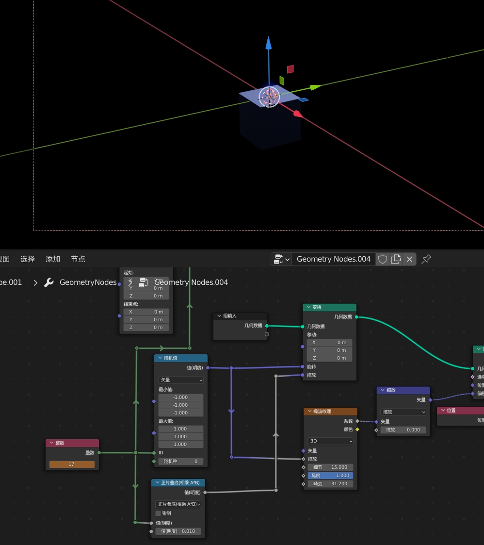 这里先练习使用变换节点控制模型位移,随机值是不可以直接连上移动的,因为随机值是一个范围量(可理解成域/场,fields,通常只能连接到棱形的接口)不是真的数值,而移动的是圆形接口,只能接受真数值,所以在随机前面加上整数节点,将随机值转换成某个数值。通过控制整数来随机化模型的位置