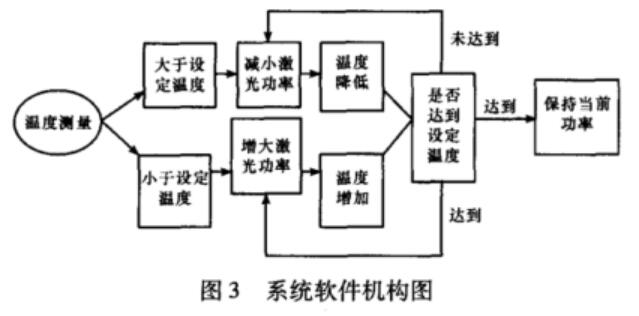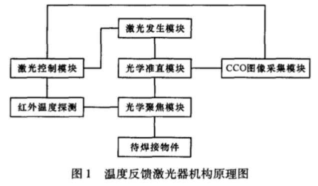 温度反馈半导体激光器系统包括半导体激光发生模块,激光控制模块,红外温度探测模块及光学系统(激光聚焦组件、CCD图像采集组件),整体框架结构如图1所示。其中激光发生模块具体为半导体激光器,可以通过电压信号控制激光输出功率的大小。激光控制模块是将外部信号或者指令通过翻译,来控制激光发生模块。CCD图像采集模块包括相机,物镜及软件处理系统。激光聚焦组件包括准直镜组件及聚焦镜组件,通过准直组件首先将激光器的光变成平行光,然后通过聚焦镜将激光聚焦,作用到工件上。整个温度反馈系统的工作流程是通过红外温度探测模块捕获焊接点温度,经过激光控制模块与设定的温度进行对比分析,将电压信号反馈给激光发生模块,实时调节激光能量的输出。图像采集模块捕获焊接点图像形成焊接轨迹。经由该激光导人准直模块和光学模块后形成的输出激光的焦点、该红外测温仪探测模块捕获接处的最小点以及CCD图像采集模块捕获到的焊接处的视场中心点三者是重合的。可在激光高速焊接过程中,实现对焊接目标温度的精确控制。温度反馈半导体激光器系统除了硬件组成部分,最重要的是电路设计及软件。