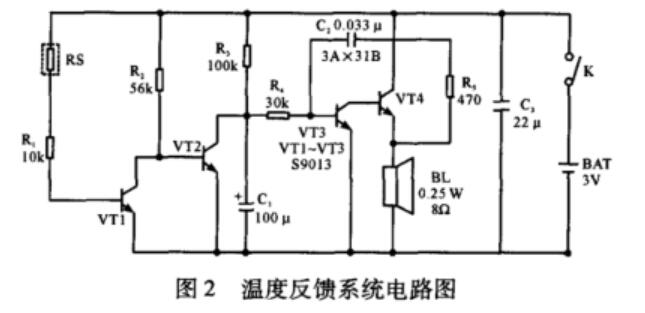 系统电路整体由三部分组成,如图2所示。其中第一部分为焊点检测表面温度电路,是下图的左侧部分,主要由温敏电阻及三极管组成,作用是采集焊点的温度值,并且将温度值转换成电流信号,然后将电流信号转换成电压信号。第二部分电路为反向电路及放大器,是下图的中间部分,主要由电感及放大器组成,实现反相器功能及信号放大功能。第三部分电路为隔离输出电路,是下图的右侧部分,主要由电容及开关组成,对外界温度干扰起到补偿和隔离输出作用。反馈系统电路实现焊点的温度信号转化成电压信号,进而对激光器发生模块的输入电压进行调节,达到调节激光器输出能量的目的。