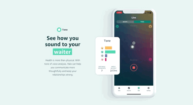在应用程序和可穿戴设备上,Halo手环除了基本的健康监测功能外,最大的亮点是其可从语调判断、监测使用者情绪变化,从生理和心理健康维度提供健康建议。