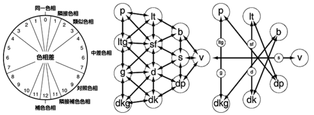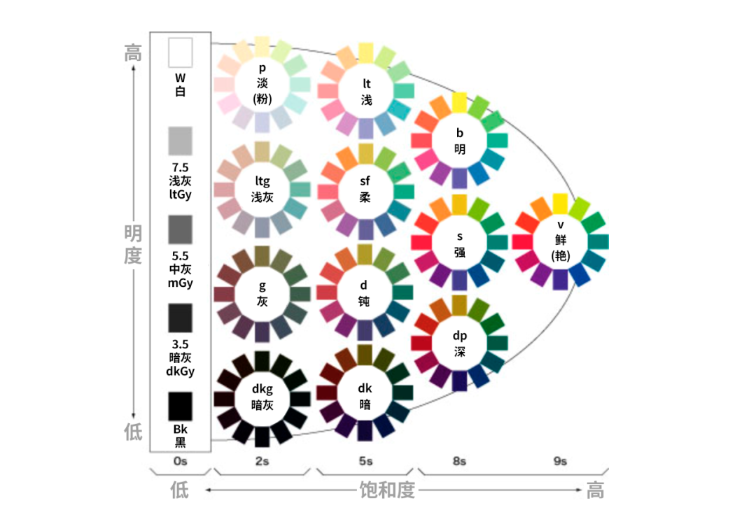 色相里存在明/暗、强/弱、暗/亮、浅/深的差异。PCCS把这种差异称为色调,我们中文设计的语境也可以说是“色调”或者“调性”。