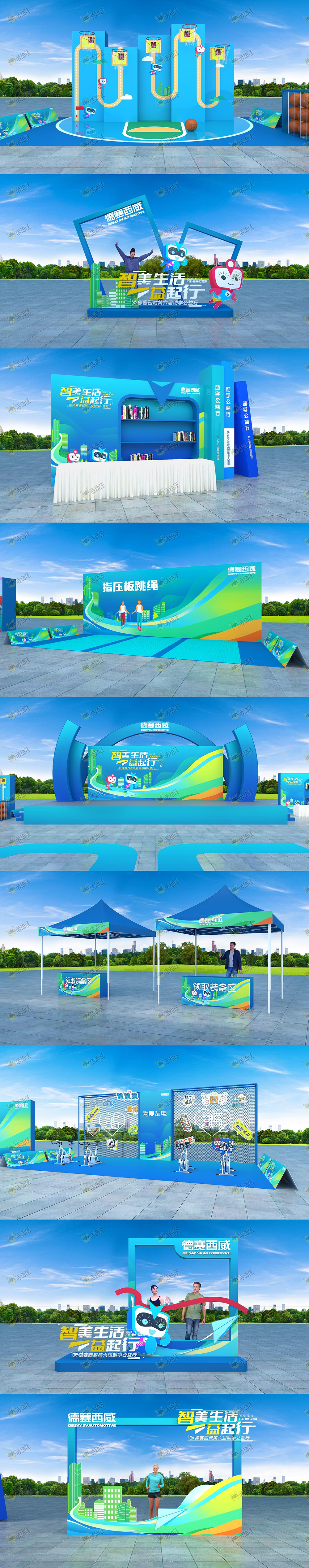 推荐理由:以清新的色调搭配扁平化的平面视觉进行活动现场布置设计,卡通形象的露出,结合创意合影框+趣味运动区的布置,给跑步活动增加了娱乐性。