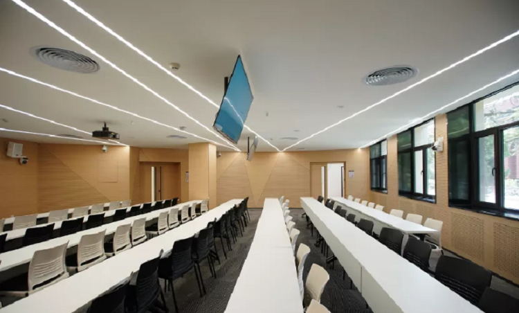 郑州学校文化建设阶梯教室打造,由阶梯组成,设计以韵律为主题,让空间设计和阶梯教室平面布局相契合,天花板设计当做重点,重复弧形造型结合反光灯槽和等待呼应韵律主题,采用新型环保材料保证吸音效果,墙面穿孔吸音铝板强调水平横向,其展现空间韵律感,构图式条形彩色座椅条插入呼应主题的同时提示教室各自标示性。