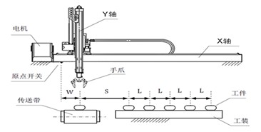 AAA客户的生产线上需要使用机械手上下料,结构如图1所示。X轴执行水平左右运动,Y轴执行竖直上下运动,手爪由气缸控制执行抓取动作。它们的任务是将右侧工装上的工件依次抓取至左侧传送带上。X轴原点距离传送带上工件放置点为W,工装上第一个工件距离传送带上工件放置点为S,工装上每个工件之间的距离均为L。